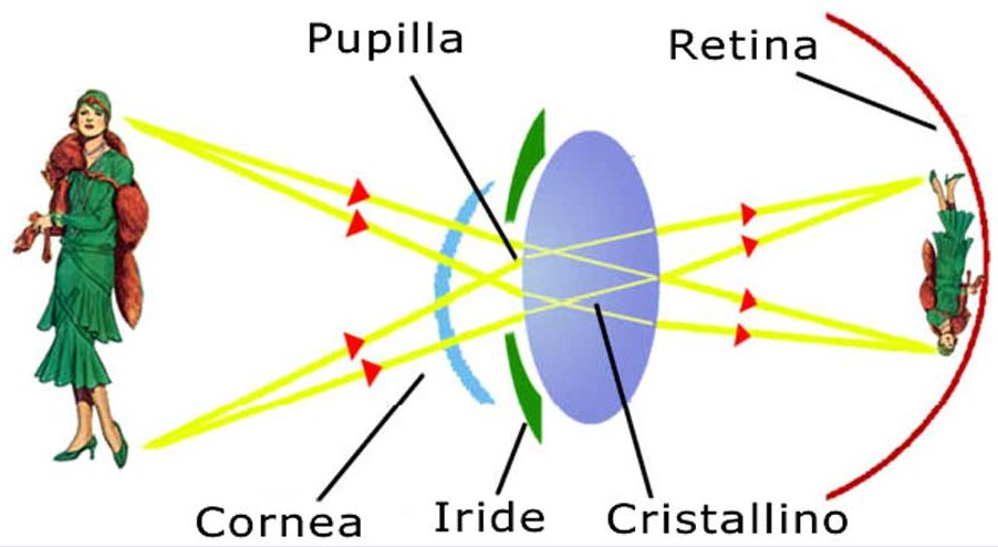L’occhio riceve un fascio di raggi luminosi provenienti da ogni punto dell’oggetto; il fascio di luce entra attraverso la pupilla che regola la quantità di luce e di conseguenza la profondità di campo. E’ l’iride che si occupa di variare il diametro della pupilla da un minimo di 2mm (se c’è molta luce) a un massimo di 8mm (se c’è poca luce). Il fascio di luce poi attraversa il cristallino che è una lente biconvessa, il quale concentra i raggi in una zona sulla retina formando l’immagine retinica dell’oggetto. Il cristallino è il responsabile della messa a fuoco dell’immagine e adatta automaticamente la sua curvatura alla distanza dell’oggetto attraverso il processo di “accomodazione“: tutti gli oggetti a distanza maggiore di 6 metri sono visti con nitidezza, mentre per osservare oggetti a distanza minore di 6 metri i muscoli all’interno del corpo ciliare si contraggono aumentando il raggio di curvatura del cristallino che diviene sufficientemente convesso in modo da fornire, anche in questo caso, un’immagine nitida.