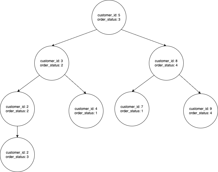 Consideriamo la tabella degli ordini del tuo negozio online. Di norma, un utente effettua un numero limitato di ordini. E il numero medio di ordini con un determinato stato è molto superiore al numero medio di ordini per utente. Pertanto, è ottimale creare un indice (customer_id, order_status) .